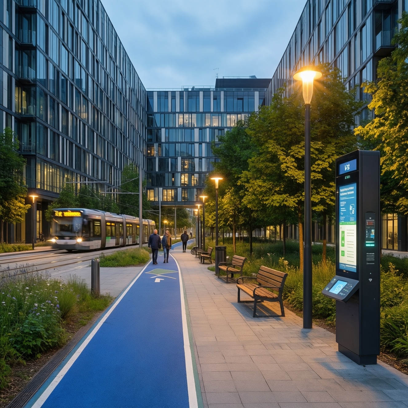 - Линейный парк вдоль магистрали: шумозащитные посадки/валы, понятные переходы, разделение быстрых и медленных потоков.